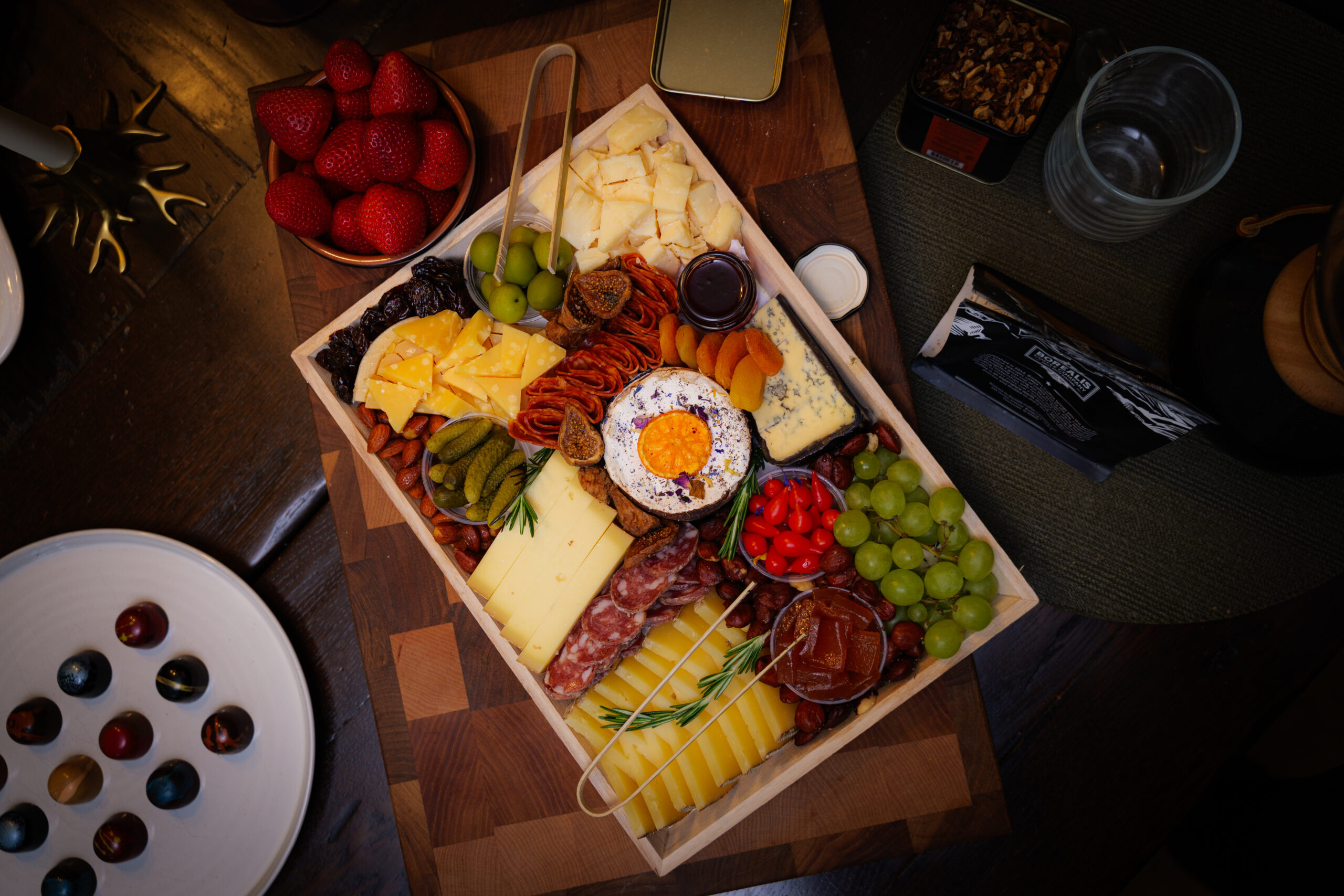 Handcrafted cheese and charcuterie board includes artisan cheeses of various textures and flavor profiles, cured meats, and accompaniments such as seasonal fruit, honey, small-batch jam, whole-grain mustard, olives, cornichons, pickled and dried vegetables, chocolate, and assorted nuts.