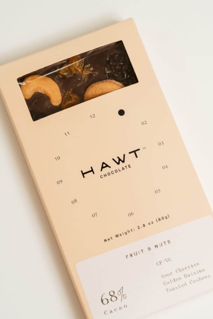 Indulge in the perfect harmony of flavor and texture with the HAWT Chocolate Fruit and Nut Chocolate Bar. Crafted from premium chocolate and generously studded with a curated mix of dried fruits and toasted nuts, this bar delivers a satisfying crunch and a rich, nuanced taste with every bite.