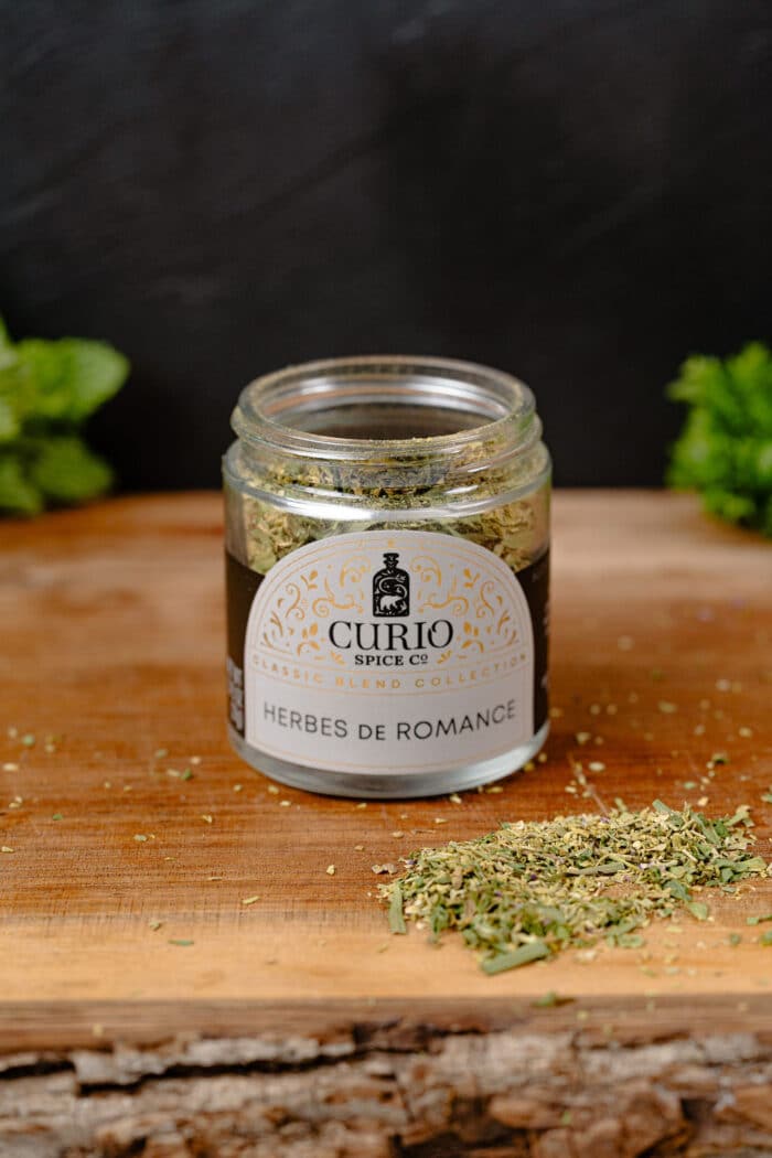 Fall in love with flavor through Herbes de Romance, a poetic and fragrant herb blend sourced from the experts at Curio Spice Company. Inspired by the classic Herbes de Provence but with a romantic twist, this mix combines Rosemary, Oregano, Parsley, Tarragon, Coriander, Bay, Mint, Lemon Verbena, oregano flowers and garlic, evoking the warmth of sun-drenched fields and the elegance of French country cuisine.