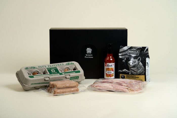 Includes: Borealis Coffee, Rhedโs Hot Sauce, Farm Fresh Eggs, Maple Pork Links, Thick-Cut Bacon.