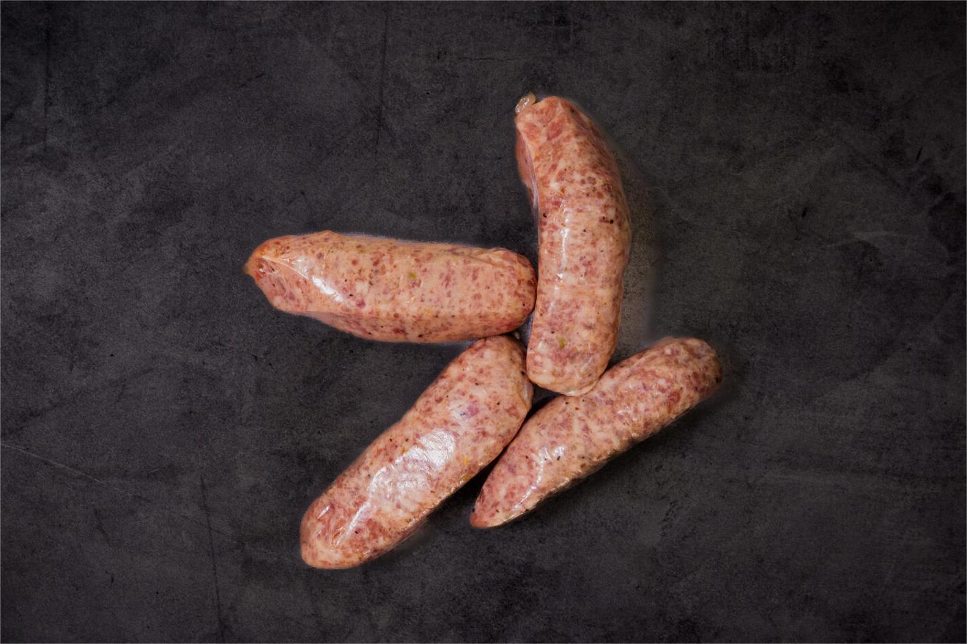 A house-made mix of Ground Pastured Pork, Kosher Salt, Cane Sugar, Fenner Seed, Paprika, Coriander, Black Pepper, Crush Red Pepper, Cayenne in a Hog Casing