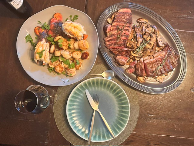 A thick cut New England Wagyu NY Strip coupled with 2 large North Atlantic Lobster tails and finished with 4 delicate chocolate bonbons.
